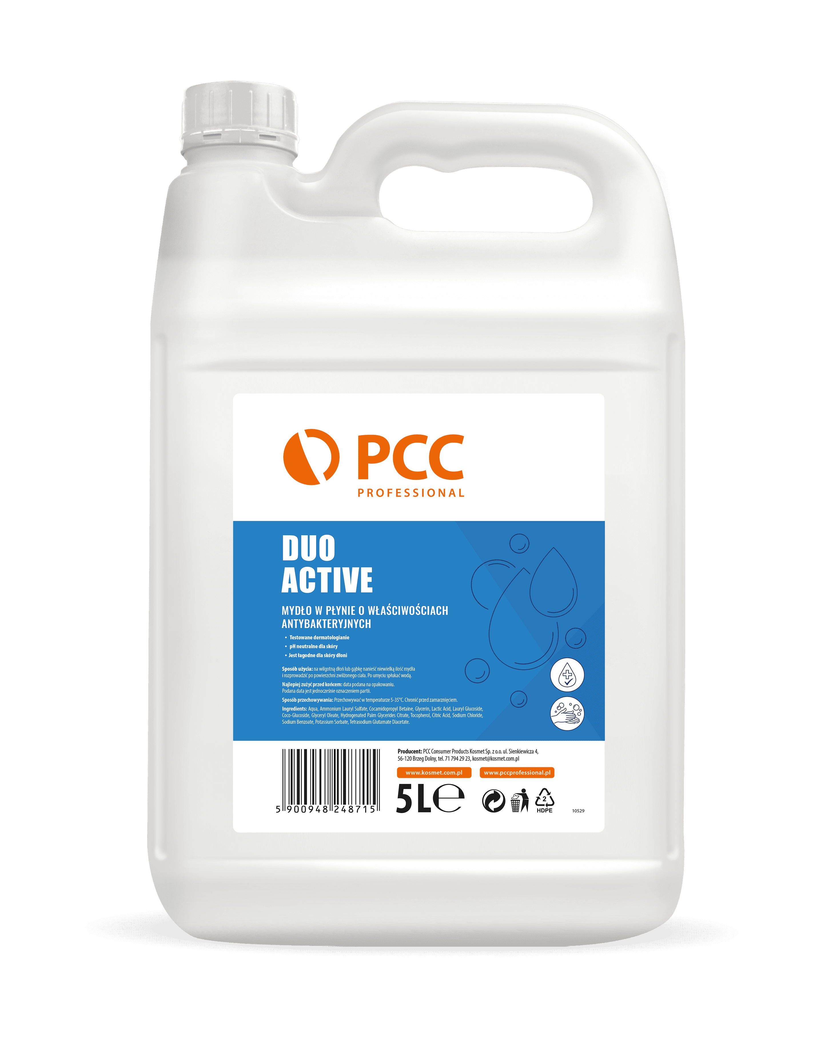 PCC PROFESSIONAL DUO ACTIVE to mydło w płynie o właściwościach antybakteryjnych wzbogacone o specjalne składniki odżywcze, które powodują odczuwalną poprawę nawilżenia skóry, elastyczność i wygładzenie.